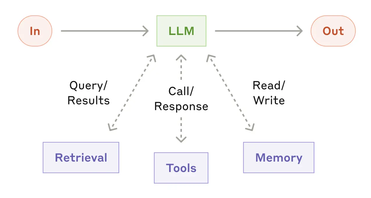 Agentic systems 的基础构建块是一个通过增强功能(如 retrieval、tools 和 memory)得到增强的 LLM。我们目前的模型能够主动使用这些能力——生成自己的搜索查询、选择合适的工具,并决定要保留哪些信息。