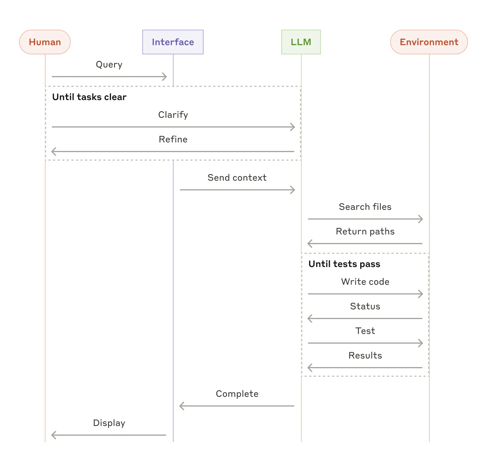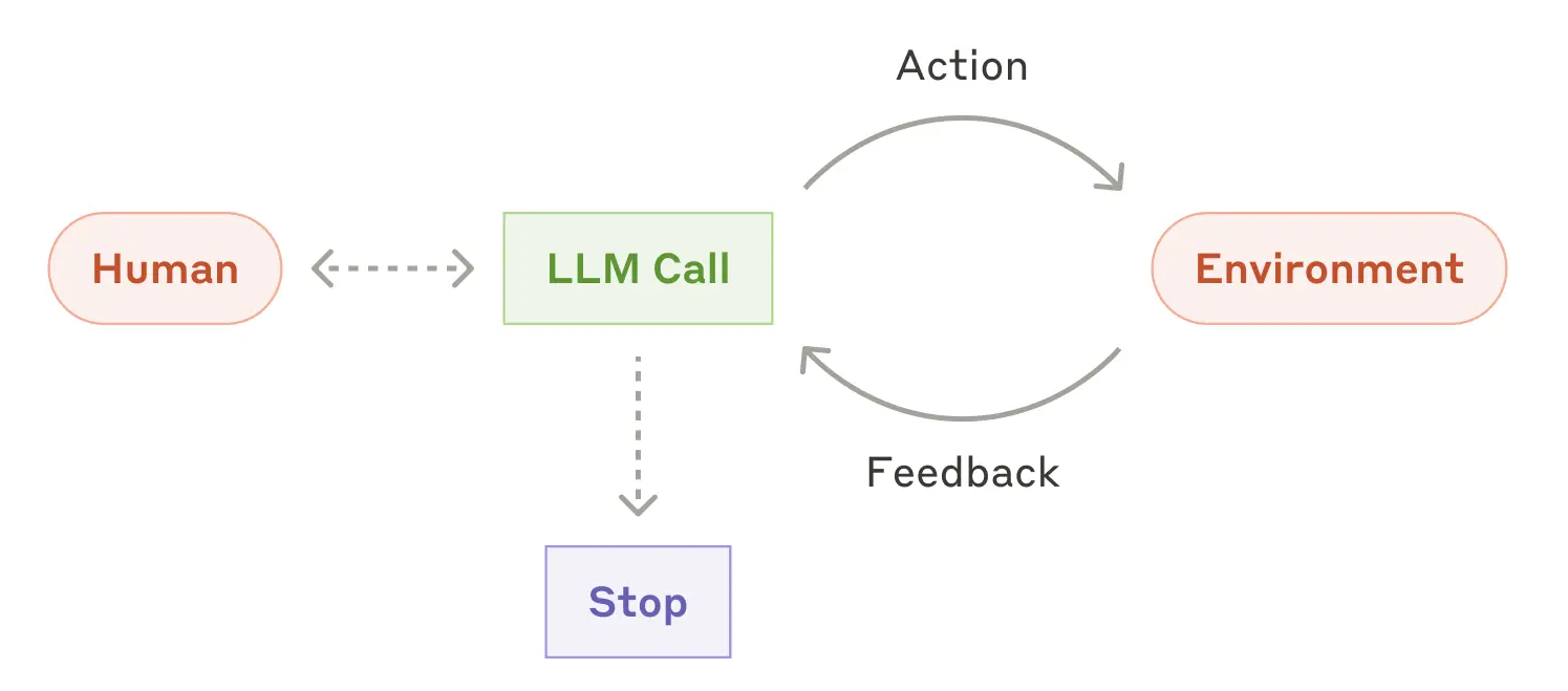随着 LLMs 在关键能力——理解复杂输入、进行推理和规划、可靠地使用 tools、以及从错误中恢复——方面日趋成熟,Agents 正在生产环境中崭露头角。Agents 的工作始于人类用户的命令或互动式讨论。一旦任务明确,agents 就会独立规划和操作,并可能返回给人类以获取更多信息或判断。在执行过程中,至关重要的是 agents 在每一步都从环境中获取“ground truth”(例如 tool 调用结果或代码执行情况)来评估其进展。然后,Agents 可以在 checkpoints 或遇到 blockers 时暂停以获取人类反馈。任务通常在完成后终止,但包含停止条件(例如最大迭代次数)以保持控制也很常见。